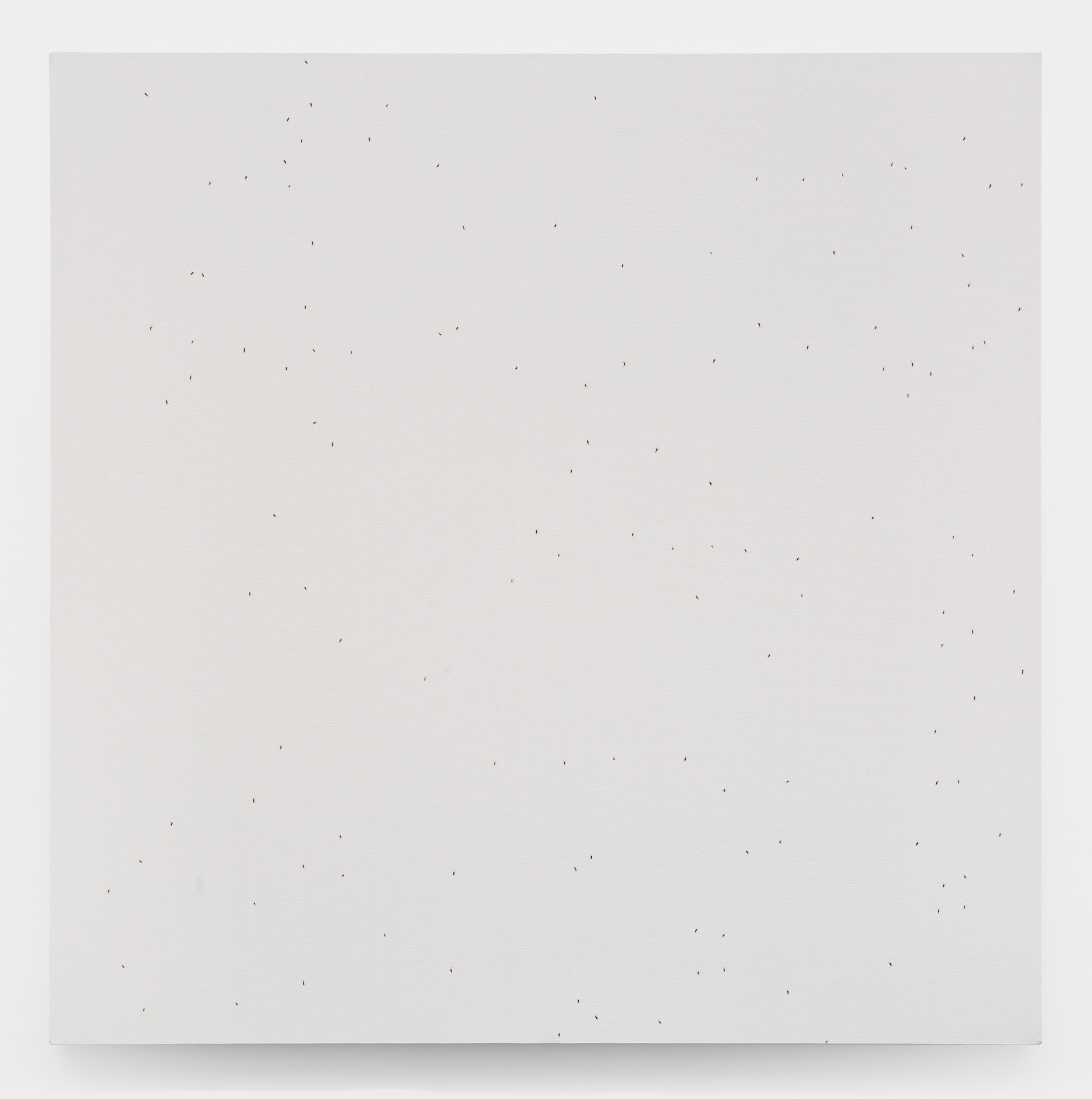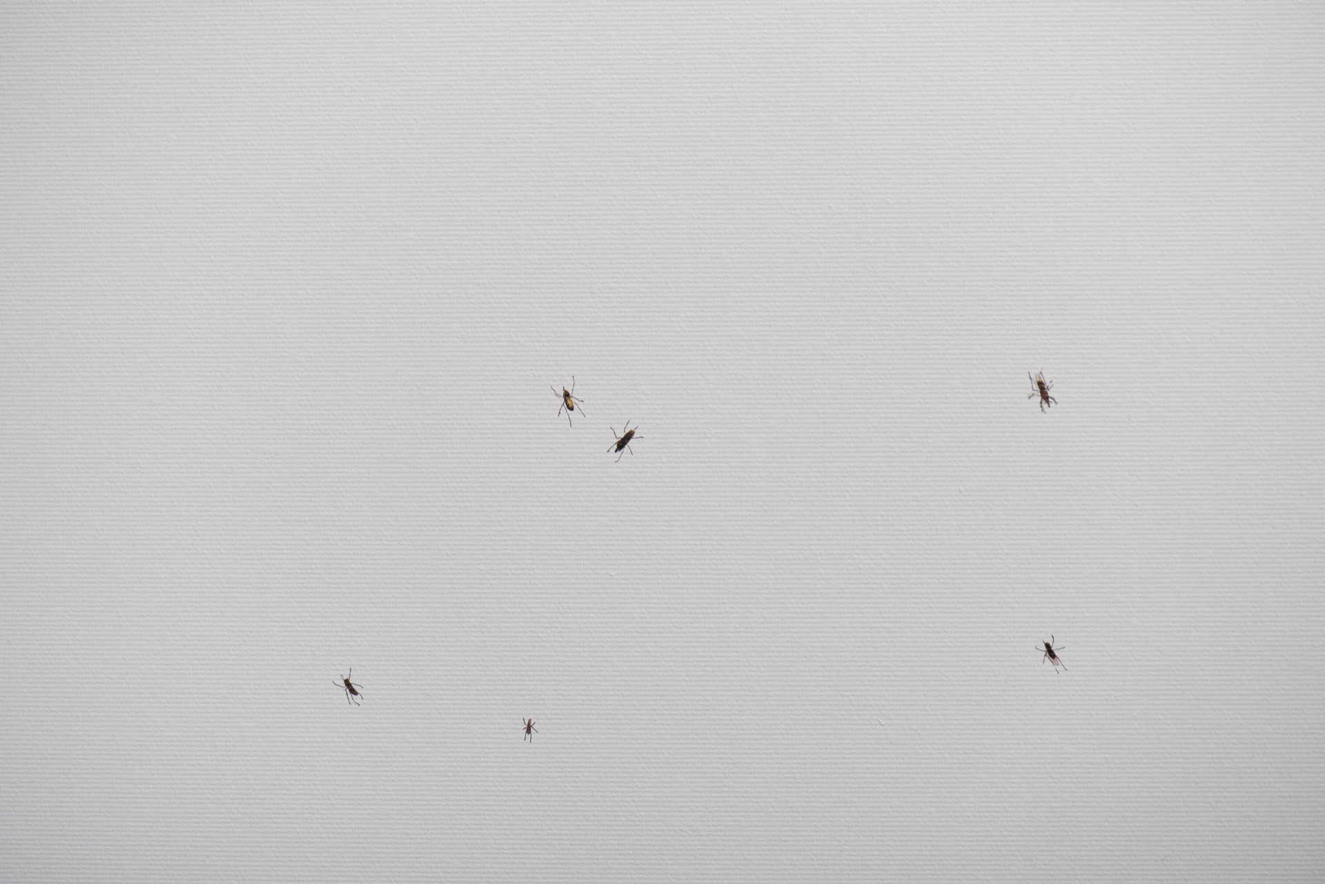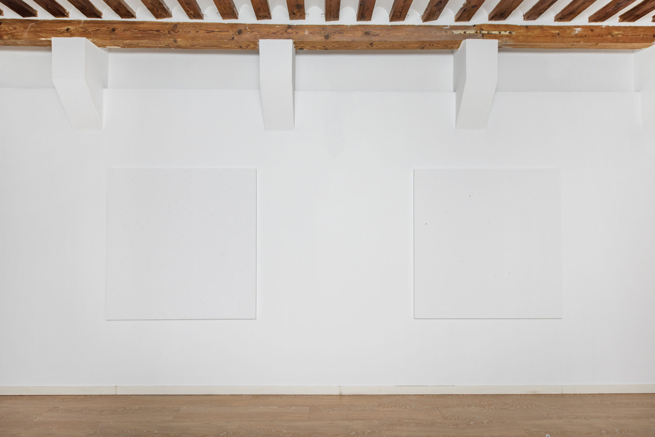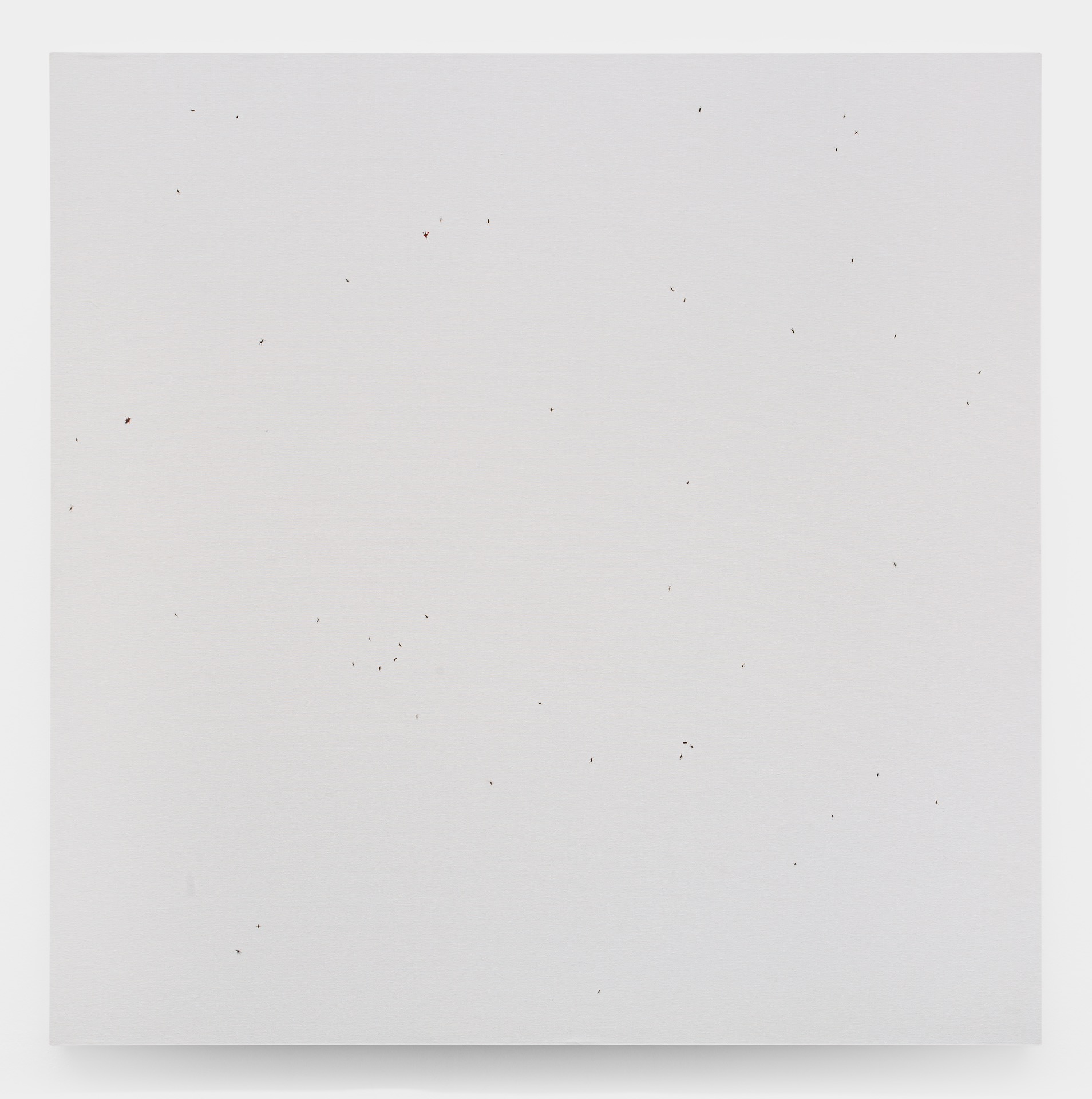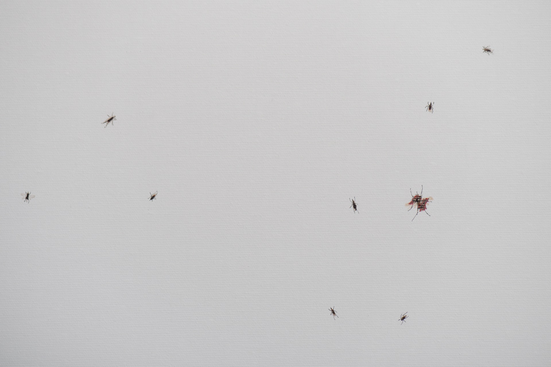 By resorting to metaphor, Giuseppe Lana concentrates the comparison on a particular insect: the mosquito. By retracing the geographical analysis between migration and adaptation, this tiny being, like humans, moves in masses and is constantly searching for new areas. It moves from one place to another, forming enormous communities, colonies that migrate primarily for survival, but also driven by climate changes. Within the exhibition rooms of the IIC in Madrid, with the supported of the Galleria Giorgio Persano of Turin, the artist presents a series of blank pages dotted with small silent presences, a procession of insects that populate a virtual space, suggesting a transit that, in the apparent miniature scale, hides the gigantic and dramatic scope of a phenomenon that inexorably marks the fate of many people and corrodes consciences. The interplay between the parts, the use of metaphor to post an argument without revealing, and the subtle deception of fiction are all elements of a narrative that Giuseppe Lana offers to the viewer’s gaze, retracing a theme, that of migration, which has been at the centre of artists’ reasoning for some time. However, Lana takes a step back, does not offer reasons or seek solutions, but only delicately observes, limiting himself to looking at something that has enormous significance. He observes the process, collects information, senses the critical issues; the facts are there for everyone to see, they are in everyone’s daily life, yet they seem so distant, just an echo for many. This is why it is necessary to highlight, to bring to the fore; perhaps it is for this reason that Lana introduces the second element of the narrative, which is the luminous one, as if to signify the absolute need to ‘bring to light’, to facilitate vision, but at the same time to unsettle, to dazzle. The luminous elements of the installation proposed by the artist are also a sort of delimitation of space. They are both a source of light and a definition of a boundary; they are another metaphor and at the same time an oxymoron. They are an extension of the blurred outline. Thus, for Lana, rhetorical figures and formal outcomes are complex tools, just as complex is the object of his reflection. Alternation between lightness of form and gravity of argumentation compose a precise rhythm; they constitute the plot with which Lana weaves the story.